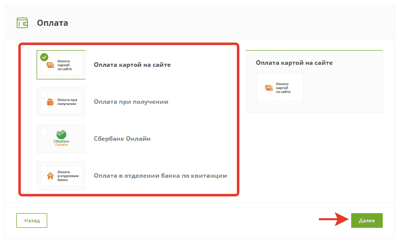 Заполните контактную информацию и оставьте комментарий к заказу, если  это необходимо. После заполнения нажмите “Далее”: