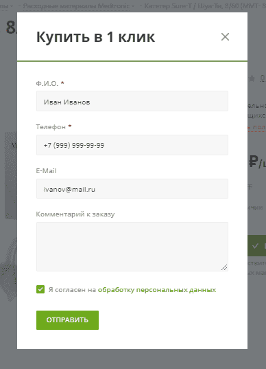 Чтобы не тратить свое время на заполнение большого количество полей с информацией, вы можете оформить “Быстрый заказ”. Для этого, после выбора необходимого товара, нажмите на кнопку “Купить в 1 клик”: