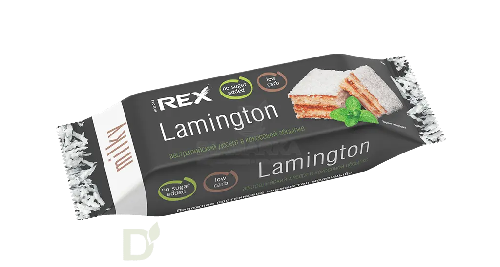 <h2>Вкуснейшее пирожное без сахара, лишних калорий и углеводов</h2> Все еще думаете, что диета - это скучно, пресно и невкусно? Только не с вкусняшками от Protein Rex. Protein Rex - настоящая находка для тех, кто соблюдает диету, не ест сахар и сахаросодержащие продукты, болеет диабетом, занимается спортом и просто соблюдает здоровый образ жизни.<br> <br> <h3>Диета без срывов - это реальность!</h3> Особенности и преимущества пирожных Protein Rex:<br> <ul> <li>в составе нет сахара, вместо него - низкокалорийный подсластитель нового поколения изомальт</li> <li> десерт обогащен пребиотиком</li> <li> пониженное содержание калорий и минимум углеводов</li> <li> натуральный и приятный вкус любимого десерта</li> </ul> Масса нетто: 50 грамм<br> <h3>Состав пирожного Ламингтон молочный</h3> протеиновый комплекс (белок яичный, концентрат молочного белка); стружка кокосовая; подсластители: изомальт, эритрит; масло кокосовое; изомальтоолигосахариды (пребиотик); масло растительное; вода питьевая; мука пшеничная; молоко сухое обезжиренное; желток яичный; мука миндальная; загустители: полидекстроза, крахмал модифицированный, каррагинан; влагоудерживающий агент глицерин; эмульгатор лецитин соевый; разрыхлитель гидрокарбонат натрия (сода пищевая); соль; ароматизаторы натуральные; консервант сорбат калия.<br> <h4>Пищевая и энергетическая ценность на пирожное</h4> белки - 6<br> жиры - 13<br> углеводы - 8,3<br> пищевые волокна - 6<br> 190 ккал