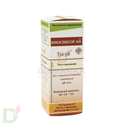 <p> Тест-полоски для визуального определения кислотности (pH) мочи, БИОСЕНСОР АН. </p> <h2>Зачем измерять кислотность мочи?</h2> <ul> <li>Нормальным pH считается показатель от 5 до 7. Эта цифра может меняться в зависимости от возраста, состояния (беременность и т.д.), потребляемой пищи.</li> <li>Отклонения pH от нормы могут<strong> сигнализировать о проблемах</strong> с почками, воспалительных процессах, повышенной кислотности желудочного сока.</li> </ul> <p> <span style="font-size: 12.16px;">Хроническое закисление организма приводит к вымыванию кальция из костных тканей, может приводить к образованию камней в почках и даже к образованию злокачественных опухолей.</span> </p> <h3>Тест-полоски Ури-pH позволяют определить кислотность мочи не выходя из дома</h3> <p> <strong>Способ применения</strong>: Опустите полоску в ёмкость с мочой на 1-2 секунды, промакните салфеткой и подождите 10-15 секунд. За это время полоска активируется, и индикатор изменит цвет. </p> <p> Сравните цвет полоски с таблицей значений на упаковке. </p> <p> <span style="font-size: 12.16px;">Диапазон определяемых значение рН  в моче (в ед.рН):  </span><span style="font-size: 12.16px;">5,0; 6,0 [6,5]; 7,0 [7,5]; 8,0; 9,0</span> </p> <p> <strong>Срок годности:</strong> 2 года </p>