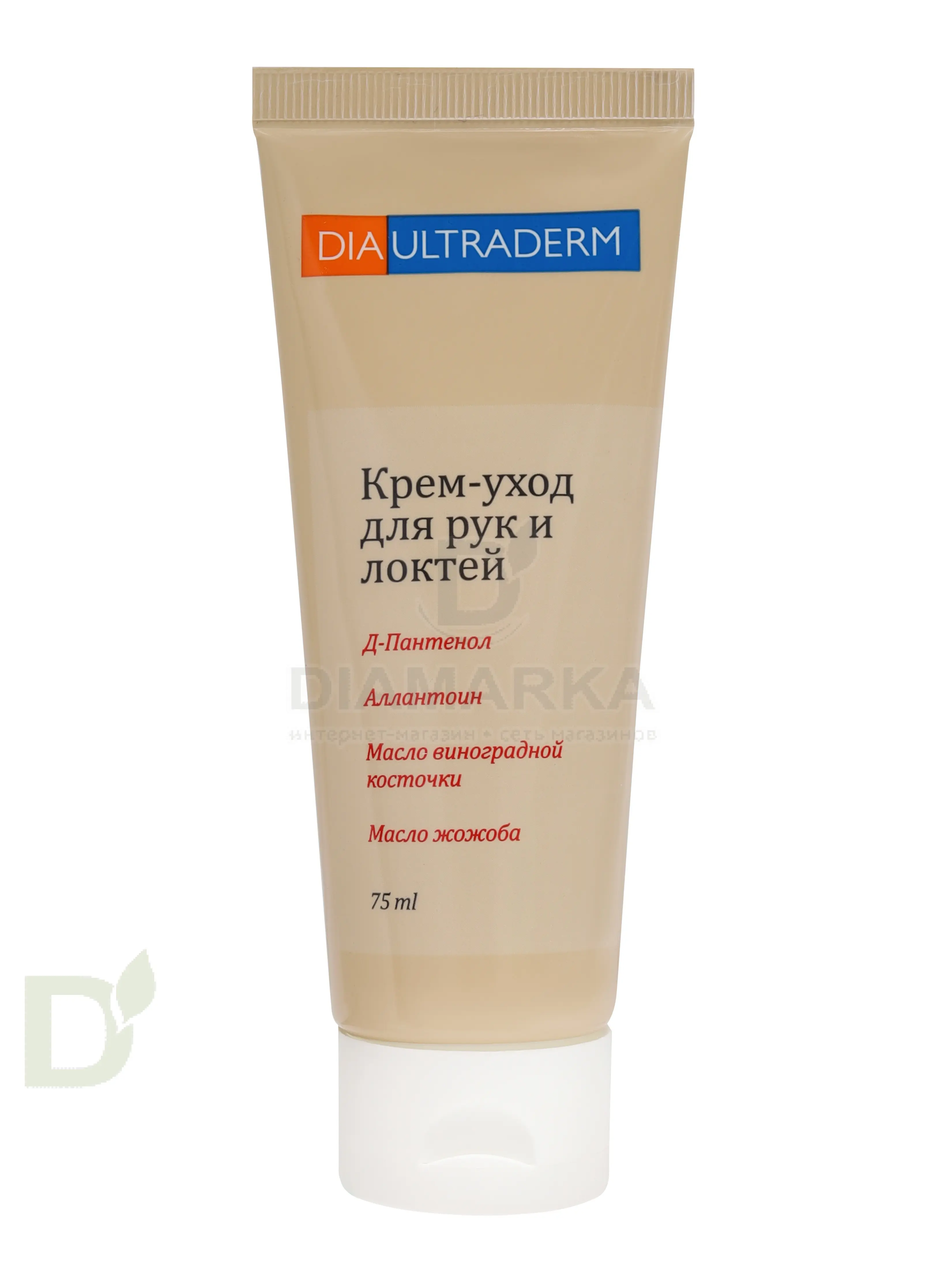 <h2>Крем для ухода за сухой и обезвоженной кожей</h2> Супер эффективный крем с быстрым действием. Оказывает на кожу комплексное воздействие:<br> <ul> <li>увлажняет</li> <li> уменьшает шелушения</li> <li> снимает раздражения</li> <li> восстанавливает защитные функции эпидермиса</li> </ul> <h2>За супер увлажнение отвечают следующие компоненты</h2> <ul> <li>Д-Пантенол. Способствует регенерации кожи, обладает противовоспалительным действием</li> <li> Аллантоин. также отвечает за процессы восстановления эпидермиса и деления клеток</li> <li> Масла виноградной косточки и жожоба. Смягчают, питают и увлажняют сухую кожу</li> </ul> Все вместе эти компоненты не только устраняют неприятные ощущения, связанные с сухостью, но и помогают вернуть коже красивый, здоровый, ухоженный вид!<br> <h2>Как использовать Диаультрадерм для рук и локтей</h2> Наносите крем на чистую и сухую кожу массирующими движениями. Втирайте до полного впитывания. Используйте по мере необходимости.<br> <br> Срок годности: 24 месяца с даты производства.<br> Объем: 75 мл