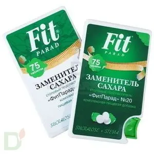<p> ФитПарад №20, плоский флакон с таблетками, 75 штук - инновационный сахарозаменитель. Обладает великолепным вкусом и улучшенными потребительскими свойствами благодаря сбалансированному составу тщательно подобранных компонентов. ФитПарад №20 отлично подойдёт для замены сахара людям с диабетом, а так же тем, кто заботится о своём весе. </p> <h1>1 таблетка "ФитПарад" №20 = 1 чайной ложке сахара</h1> <p> <br> Рекомендации по применению: перед употреблением растворить в жидкости. </p> <h2>Безопасная доза суточного потребления - 20 таблеток.</h2> <p> <br> <strong>Состав:</strong> лактоза, подсластитель - сукралоза, L-лейцин, стабилизатор кроскармеллоза, подсластитель - стевиозид, антислеживающий агент - диоксид кремния, инулин.<br> <br> <strong>Масса:</strong> 18 г </p> <p> <strong>Энергетическая ценность:</strong> 310 кКал на 100 г </p> <p> <strong>Пищевая ценность на 100 г:</strong><br>     Белки - 0 г<br>     Жиры - 0 г<br>     Углеводы - 73,3 г </p> <p> <strong>Срок годности с даты изготовления: 2 года.</strong><br> <br> </p>