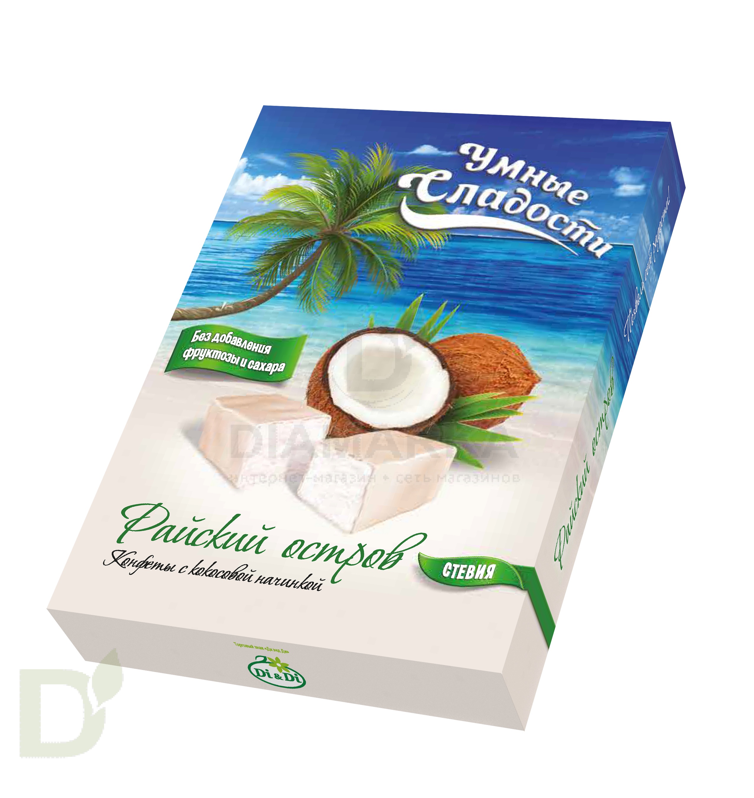 <h2>Правильные конфеты для правильных чаепитий</h2> Конфеты = сладость = много сахара. Такая установка сидит в голове у большинства людей. Хорошо, что мы живем в 21 веке и конфеты без сахара и его аналогов - вполне себе реальность, а не мечта!<br> <h2>Преимущества конфет без сахара</h2> <ul> <li>низкая скорость усвоения углеводов</li> <li> меньше калорий (в сравнении с обычными конфетами)</li> <li> не провоцируют развития кариеса</li> <li> ПРИ ЭТОМ по вкусу неотличимы от обычных конфет!</li> </ul> <h2>Что дает сладость</h2> Как было сказано выше, умные сладости не содержат сахара и его углеводных заменителей. Вместо них используются изомальт и стевия - природные низкокалорийные заменители, которые не оказывают на организм столь вредного воздействия, как сахар и аналоги.<br> <br> Масса: 90 грамм<br> <h2>Состав конфет Райский остров</h2> патока, жир растительный нелауринового типа, подсластитель изомальт, мальтодекстрин, сыворотка сухая молочная, молоко сухое обезжиренное, стружка кокосовая, эмульгатор лецитин соевый, подсластитель стевиозид, ароматизатор «кокосовые сливки», ваниль; глазурь белая: жиры растительные лауринового типа, подсластитель изомальт, сыворотка сухая молочная, молоко сухое обезжиренное и цельное, мальтодекстрин, эмульгатор лецитин соевый, подсластитель стевиозид, ваниль. Содержит подсластитель. При чрезмерном употреблении может оказывать слабительное действие.<br> <h2>КБЖУ на 100 грамм конфет</h2> <ul> <li>415 ккал</li> <li> б - 2,5</li> <li> ж - 18,3</li> <li> у - 65,5</li> </ul>